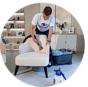 Как проводится химчистка? Сначала мы оцениваем уровень загрязнения. Если нужно - пылесосим мебель. Затем наносим средство, Пин Ап растворяет загрязнения на обивке. Но не бойтесь, остатки чудо-жидкости будут нейтрализованы и удалены.